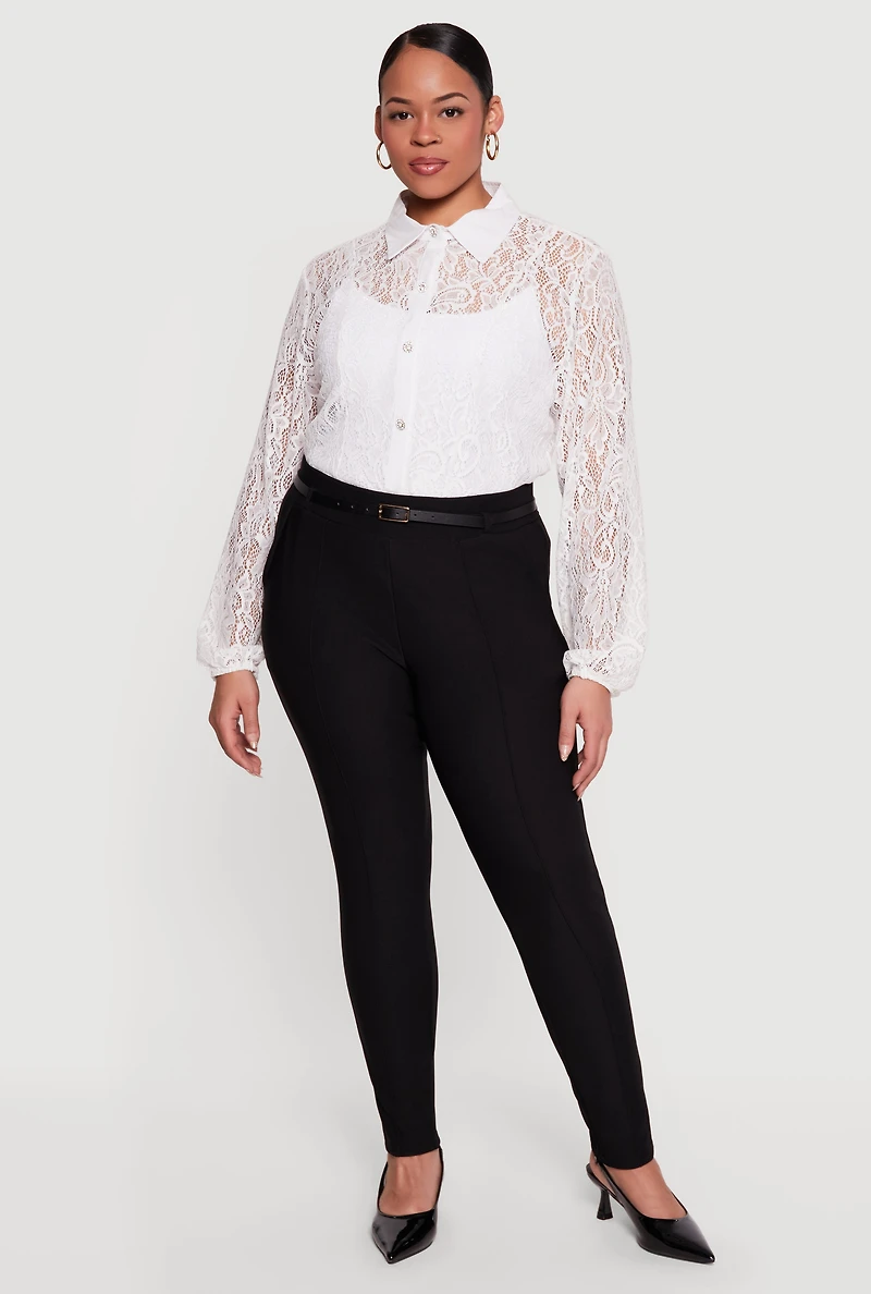 These high-waisted skinny-leg dress pants offer a sleek silhouette with a polished finish. Designed for dressy occasions or officewear, they feature pintuck details that add subtle sophistication. The included belt highlights the waist, while faux back pockets keep the look streamlined. High-rise waist with a skinny fit for a flattering shape Pintuck detail adds tailored elegance Includes a belt to define the waist Faux back pockets maintain a smooth, clean look Model Pictured Wearing Size 1X Height 5 ft 6 in, Bust 42 in, Waist 35 in, Hips 49 in Fits True To Size Measurements Inseam: 29 in Content and Care Material: 95% Polyester, 5% Spandex Care Instructions: Machine Wash, Tumble Dry Country Of Origin: China Rainbow Item Number 1961074648835 BLACK - 1961074648835001