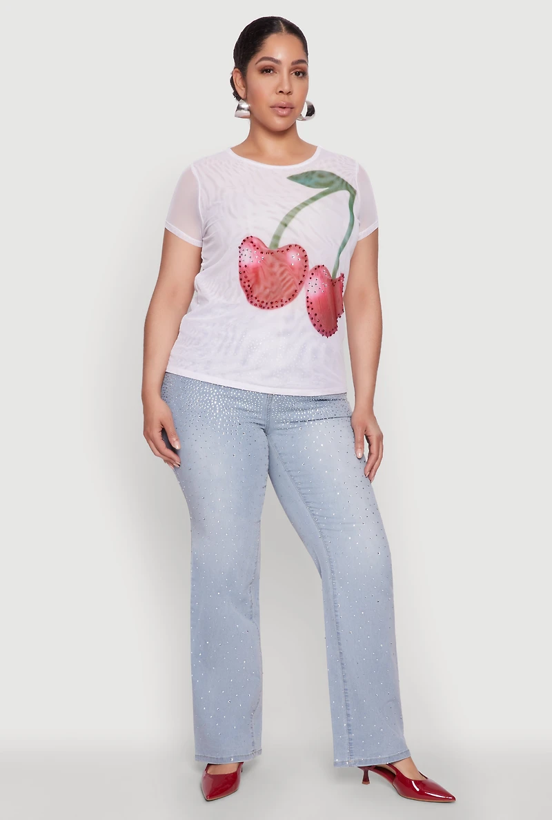 Plus Rhinestone Cherry Print Mesh Top in Ponce, PR