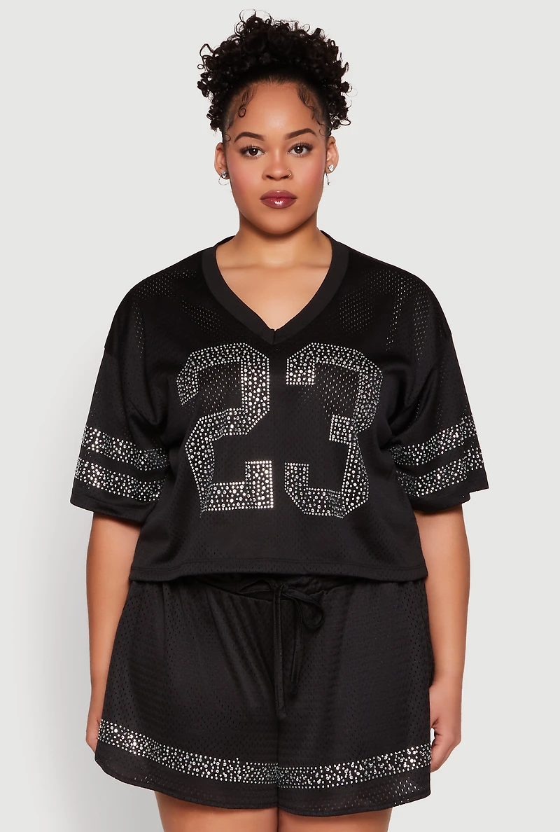 Plus Rhinestone Graphic Print Mesh Jersey