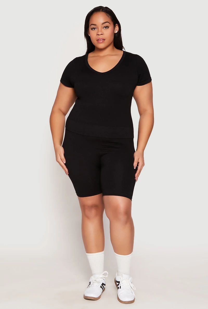 Plus Seamless V Neck Top and Biker Shorts Set