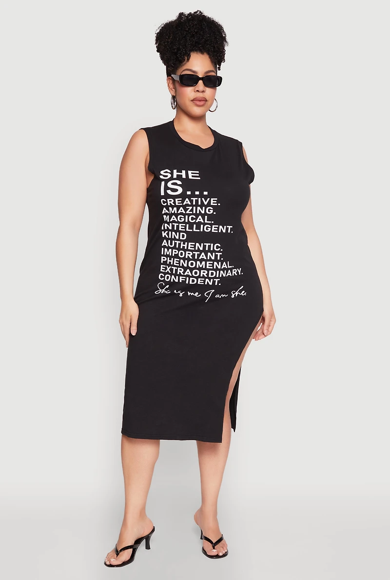 Step into effortless style with our Plus Size She Is Graphic Print Dress. Perfect for casual days, this mid-length T-shirt dress features a classic fit and a fun graphic print that makes a statement. The sleeveless design and crew neckline keep you cool and comfortable, whether you're out running errands or hanging with friends. Plus, the side slit adds a touch of flirty flair, making it a must-have for your wardrobe. Affordable, trendy, and designed to flatter, this dress is your new go-to for everyday chic.