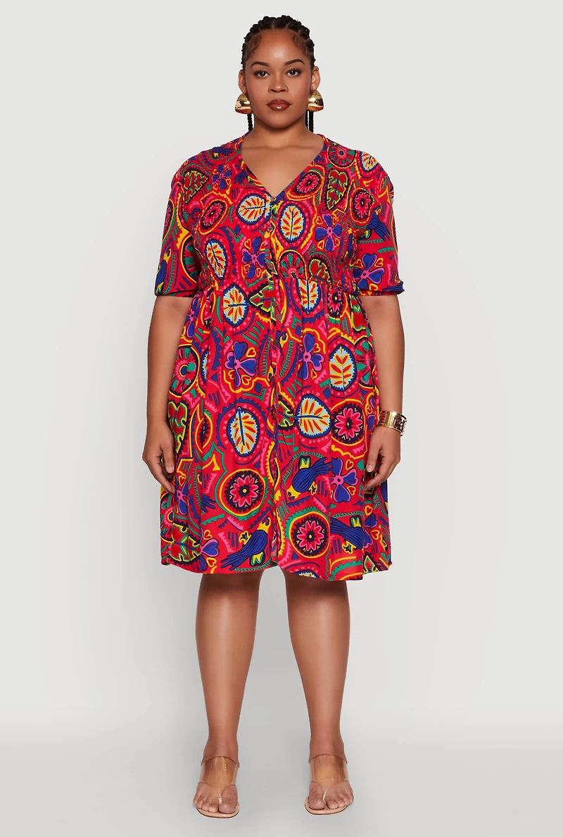 Plus Smocked Short Sleeve V Neck Shirt Dress