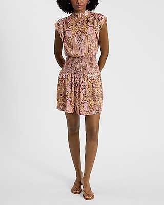 Paisley Mock Neck Smocked Waist Mini Dress