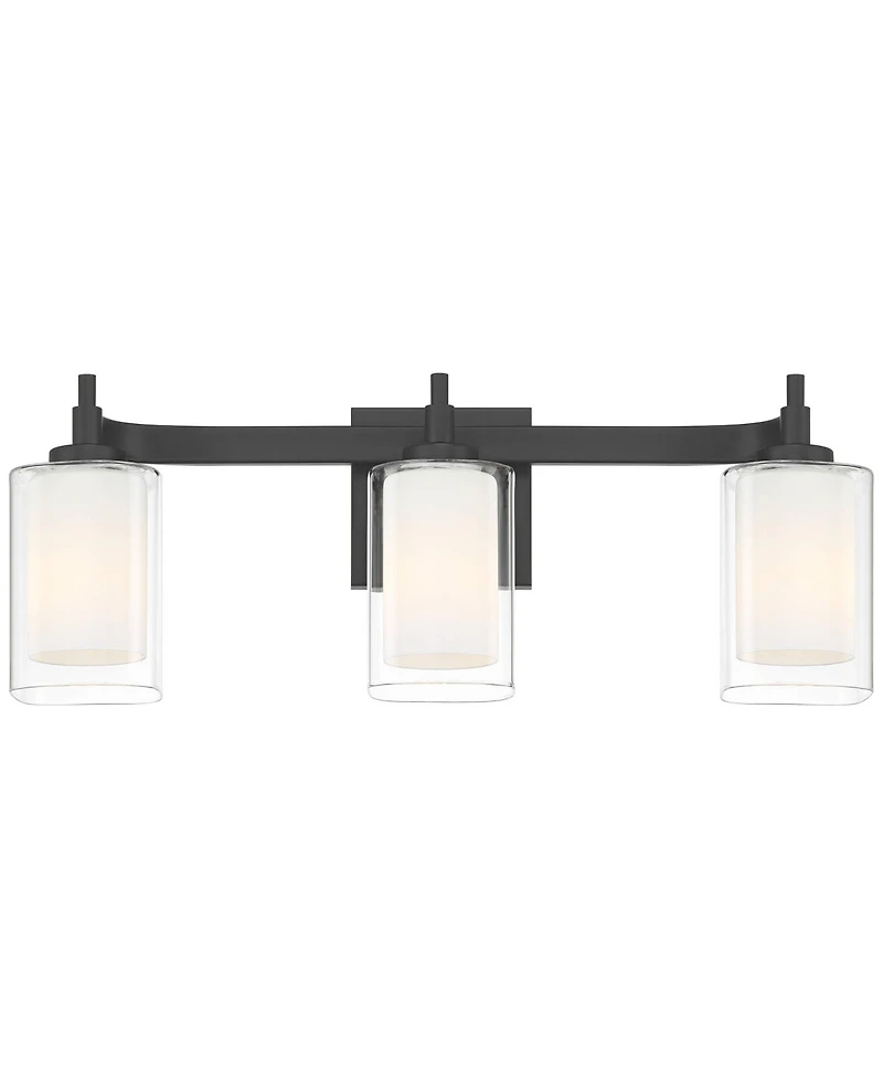 From the Possini Euro Design brand, the Bolaire bathroom vanity light is here to teach a lesson in transitional style minimalist. Comfortable in a variety of home decor settings, this stylish matte black finish light comes with three dual-lined shades, with a frosted white glass interior and a clear glass exterior, each diffusing illumination from three bulbs. The Bolaire light can be mounted with the lights facing either up or down.