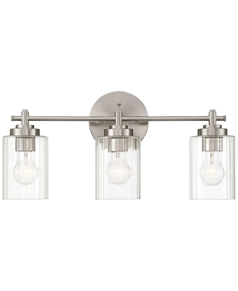 Bring vibrancy and illumination to your bathroom or vanity space with the Elizabeth bath light from the Possini Euro Design brand. Three ribbed clear glass shades allow for unfiltered illumination, banishing shadows, enhanced by a stylishly modern brushed nickel finish. Mount this fixture above your mirror or vanity space for maximum effect and style.