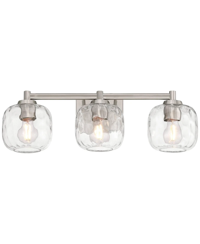 Clean and simple, the Mio bathroom vanity light, from the Possini Euro Design brand, brings industrial inspired design into the modern day. Classy and contemporary, this vanity light features a minimalist brushed nickel finish for an understated enhancement to the lighting provided by the three standard-medium base bulbs. Each bulb is housed within a clear hammered glass shade, providing both unfiltered illumination and visual interest. The Mio bath light must be mounted horizontally, but the lights can face either up or down, allowing for versatility in your lighting needs perfect for both mirror or vanity spaces.