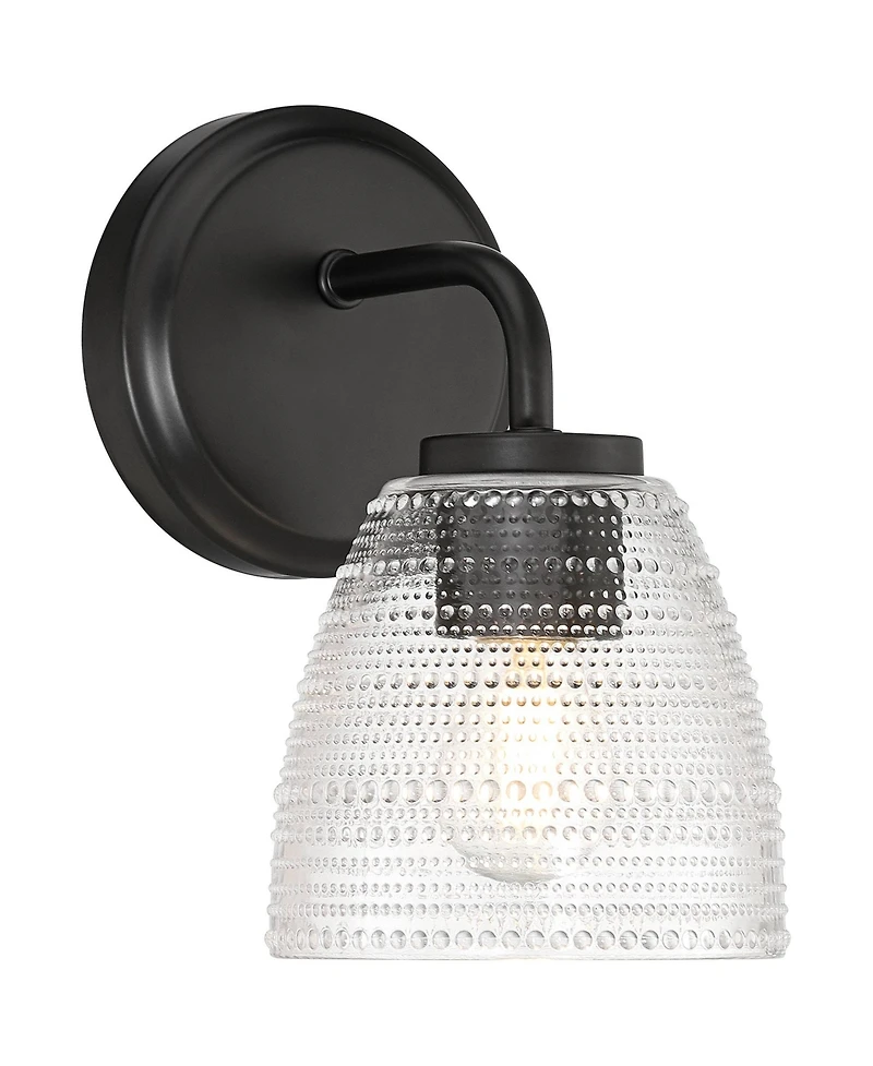 Who says bathroom or vanity spaces have to be boring? From the Possini Euro Design brand, the Sabrina single light wall sconce shines in black finish, working to enhance a bright bulb. The bulb is housed within a beaded clear glass shade with a stylish textured bubble pattern, modeled after fine glassware. Visually interesting and endlessly elegant, this is the perfect design to bring modern charm to your home.