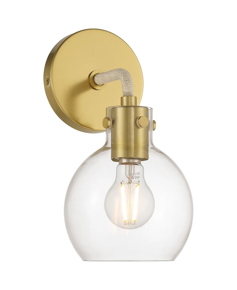 Bring a little coastal charm to your modern home with the Wicander wall sconce from the Possini Euro Design brand. A clear glass shade evokes the feeling of port holes upon an ocean-faring ship, while a wrapped rope accent reminiscences about finding interesting driftwood pieces on the beach. The look is completed by a classy antique brass finish.