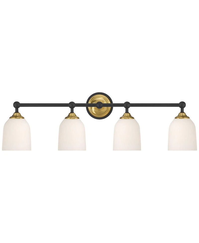 The Zaragoza collection of indoor lighting designs, from the Possini Euro Design brand, combines the glamour of contemporary modern style with the classicism of European aesthetics. This four-light bathroom vanity light comes in a gold finish, enhanced by black finish accents, and completed by riddled white glass shades for a multi-color modern appeal. Damp location rated for indoor use, the Zaragoza collection is perfect for completing your bathroom or vanity space.