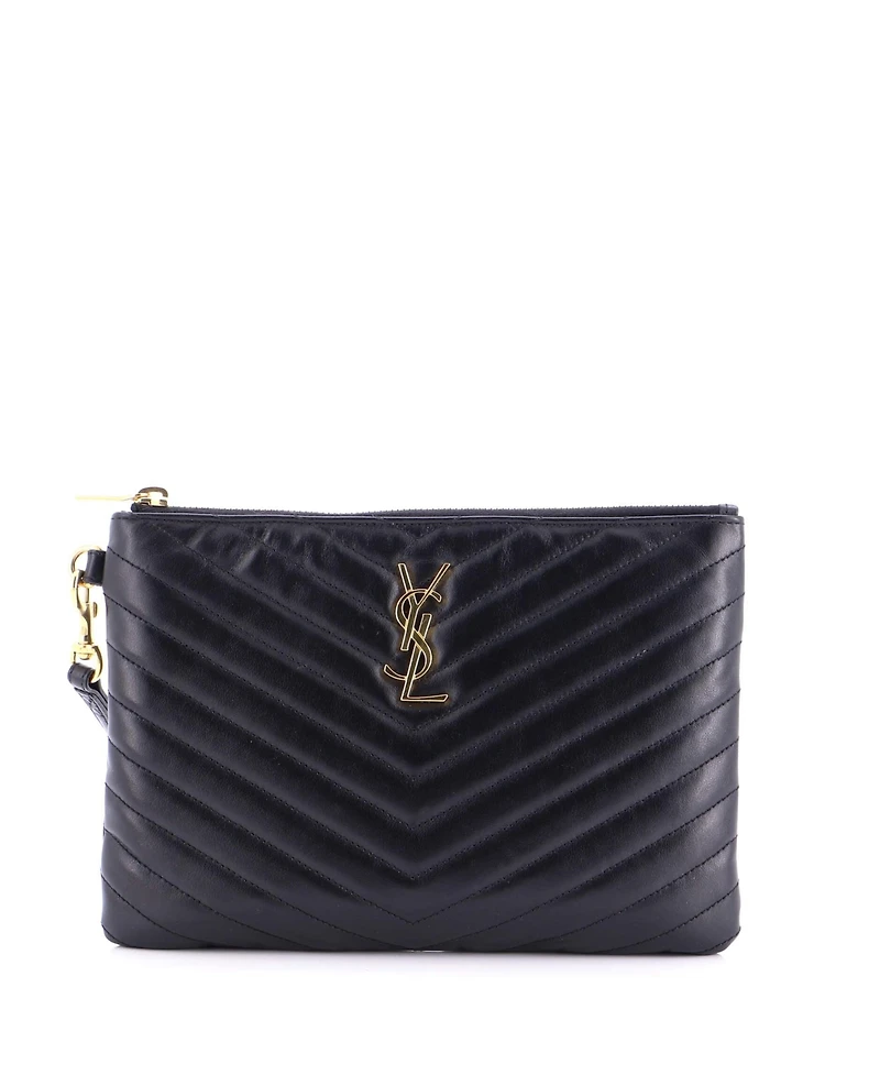 Pre-Owned Saint Laurent Small Classic Monogram Wristlet Pouch Matelasse Chevron Leather