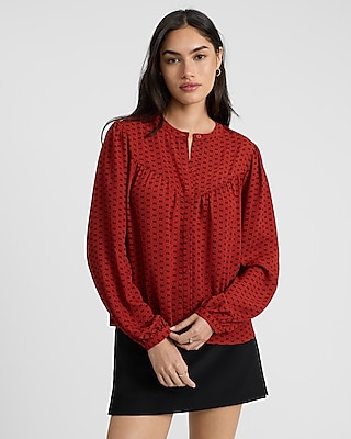 Printed Ruffle Tie Neck Long Sleeve Top