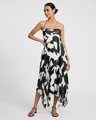 Printed Pleated Tie Halter Sweetheart Asymmetrical Midi Dress