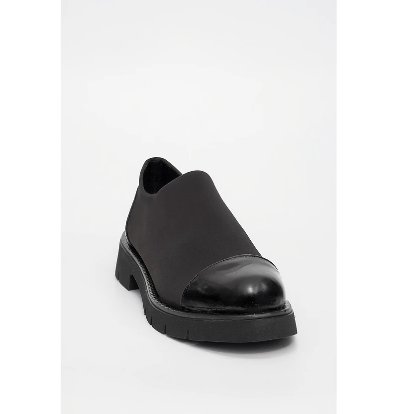 A versatile everyday shoe that blends glossy patent accents with flexible scuba fabric for all-day comfort