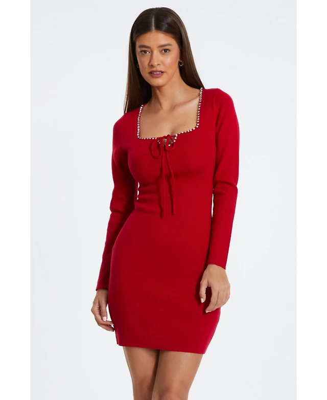 Quiz Women's Knit Diamante Trim tie Neck Long Sleeve Mini Sweater Dress