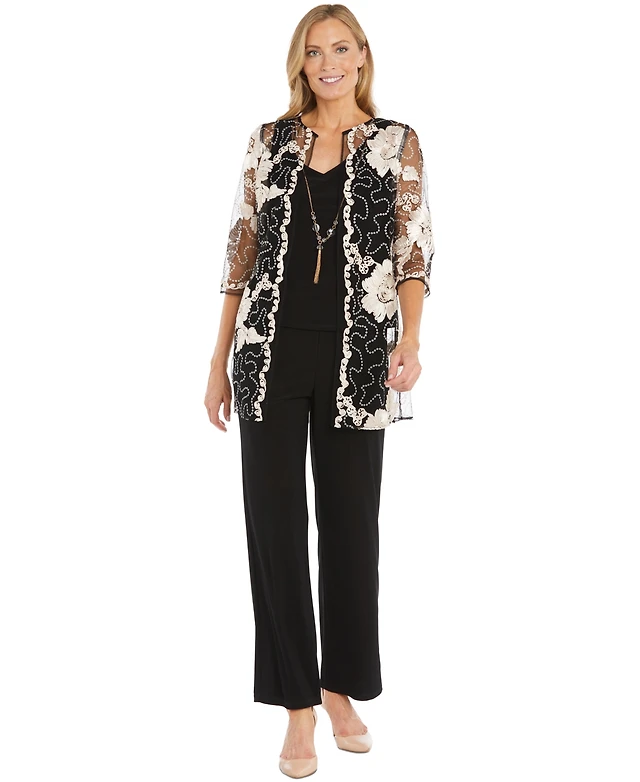 R & M Richards Women's Embellished Sheer Long Jacket, Sleeveless Top and Pants Set