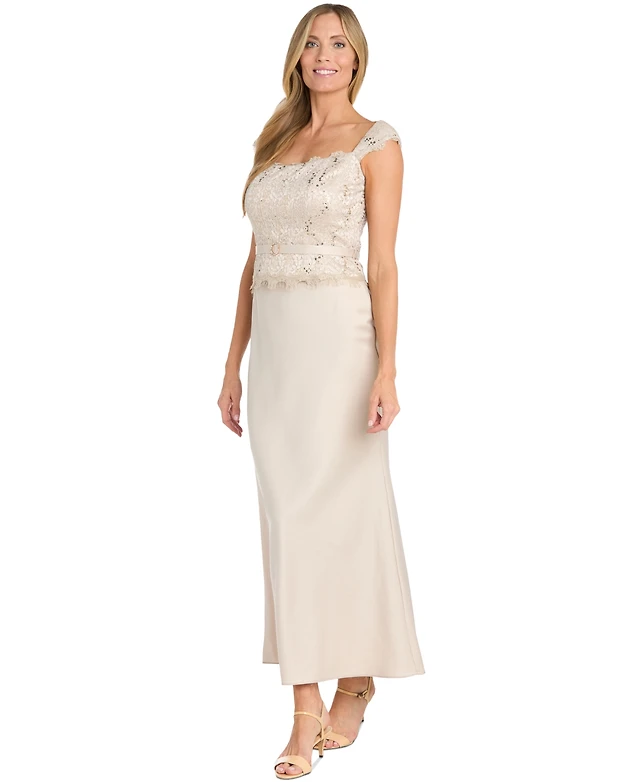 R & M Richards Women's Long Embellished Illusion-Detail Lace Gown