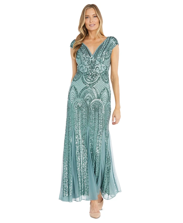 R & M Richards Women's Beaded Godet-Mesh V-Neck Gown