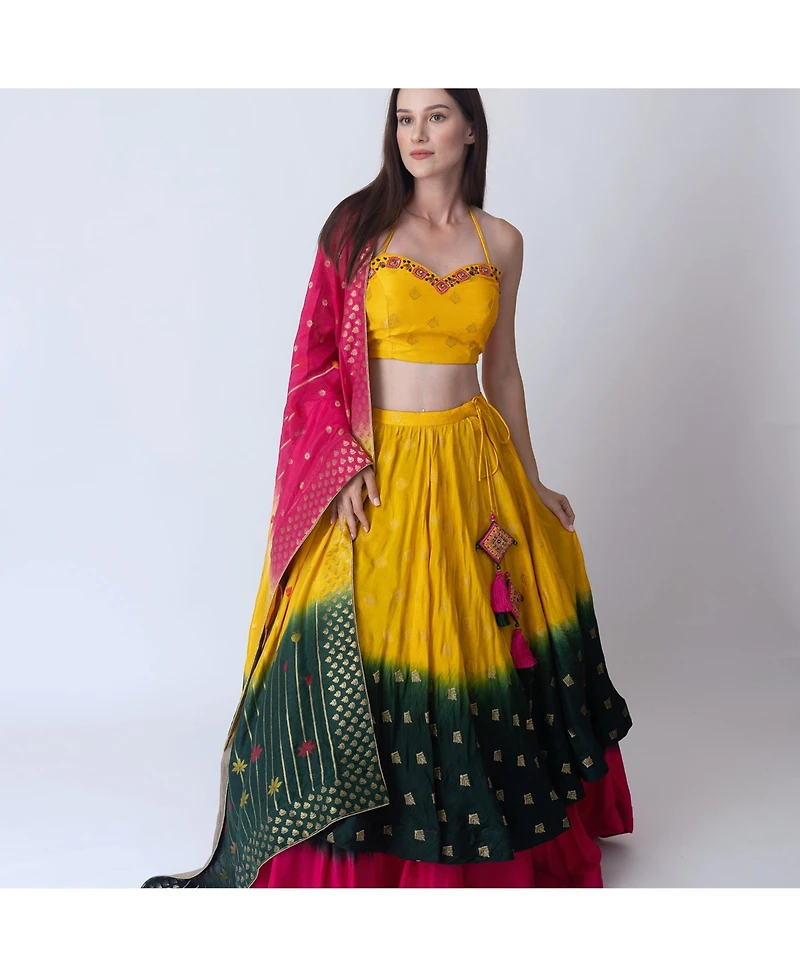 Make a statement at your next special occasion with this hand tie dyed layered Lehenga. Crafted with silk fabric, off shoudler blouse with intricate embroidery and silk dupatta.