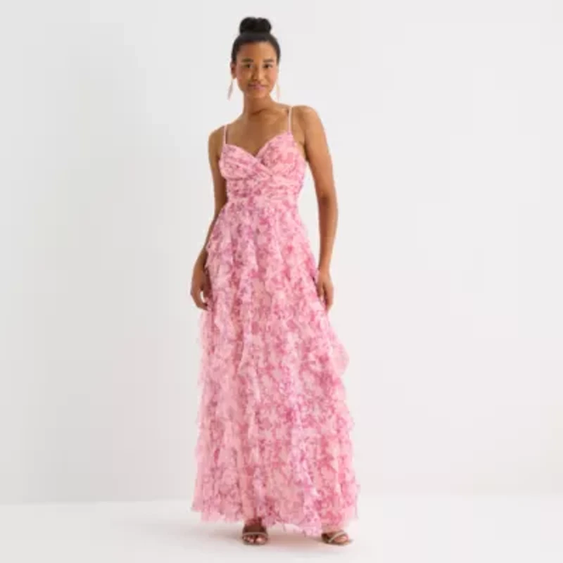 This Radiante Couture juniors' A-line dress plays with soft florals and delicate spaghetti straps, shaped with a sweetheart neckline. Vertical ruffle details add movement, while the zipper and tie closure keep the fit secure and easy. Keep accessories minimal and heels to elevate the overall look.