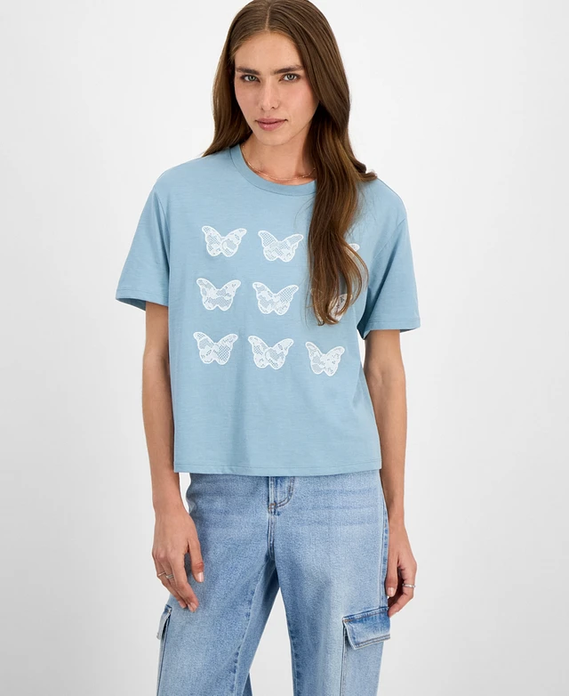 Rebellious One Juniors' Lace Applique Butterfly T-Shirt