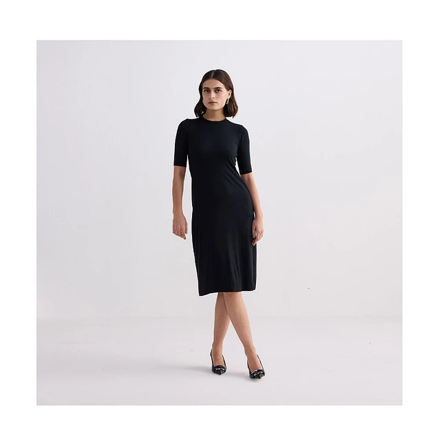 Reistor Women's High Crew Neck Elbow Sleeves Fitted Dress Black