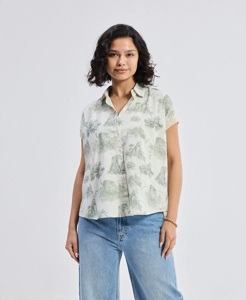 Easy, relaxed, and effortlessly stylish! This button-down shirt features a flattering V-neck, extended sleeves with ribbed details, and an unusually chic animal print. Made from breathable, 100% cotton fabric, it s beautifully textured, airy, and perfect for warm-weather days.