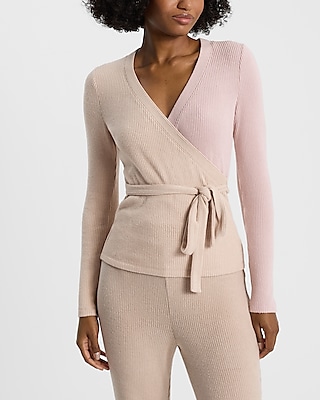 Cozy Ribbed Color Block Surplice Tie Waist Top