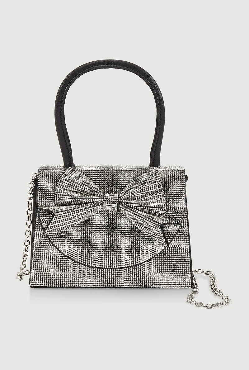 Details and Fit Rainbow Shops Bows Rhinestones Solid Removable Crossbody Chain Strap Length - 48.5 Measurements Bag Height: 5.5 in Bag Length: 7 in Bag Width: 2.5 in Content and Care Material: 100% Polyester Care Instructions: Hand Wash Country Of Origin: China Rainbow Item Number 1124077791623 SILVER - 1124077791623007
