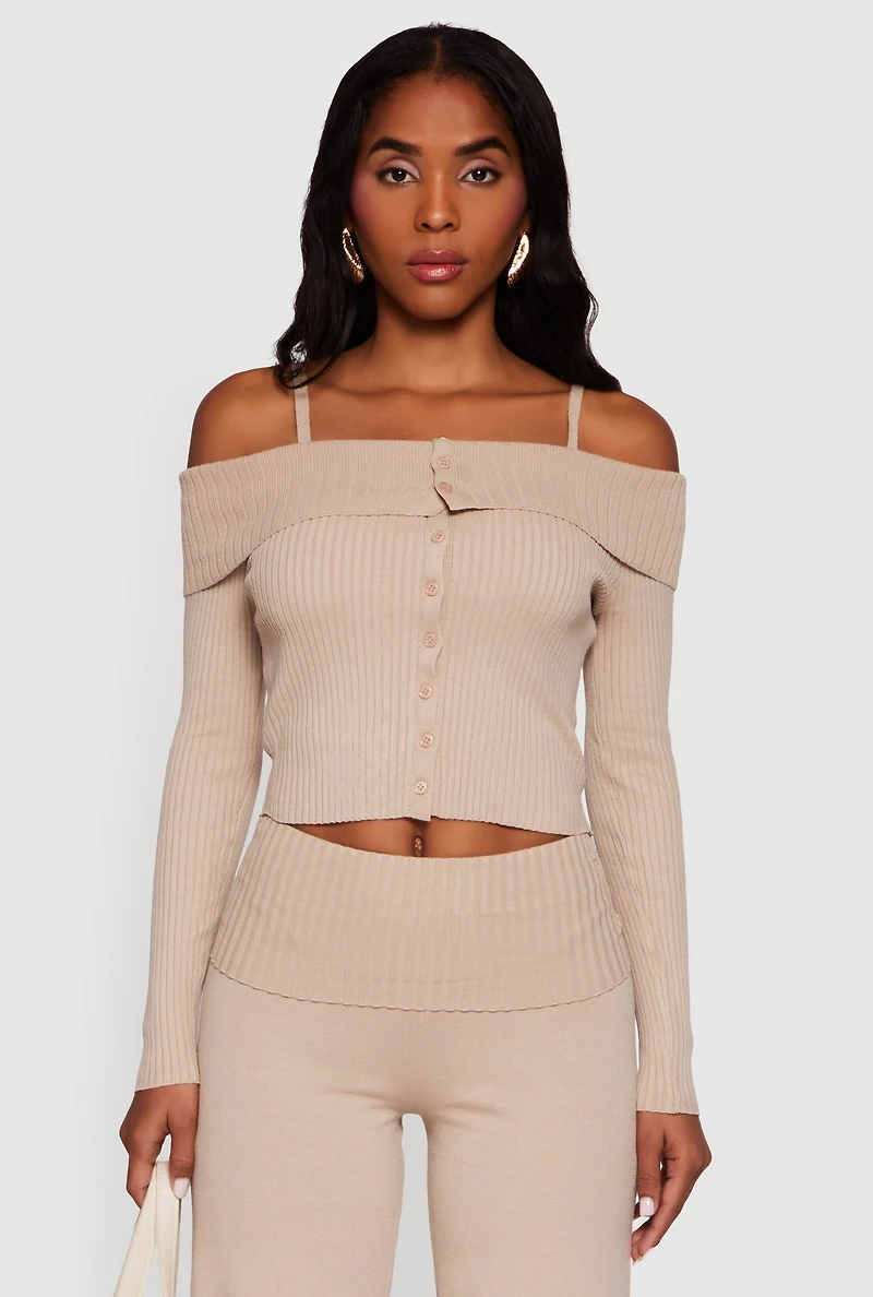 Rib Knit Cropped Fold Over Cold Shoulder Sweater