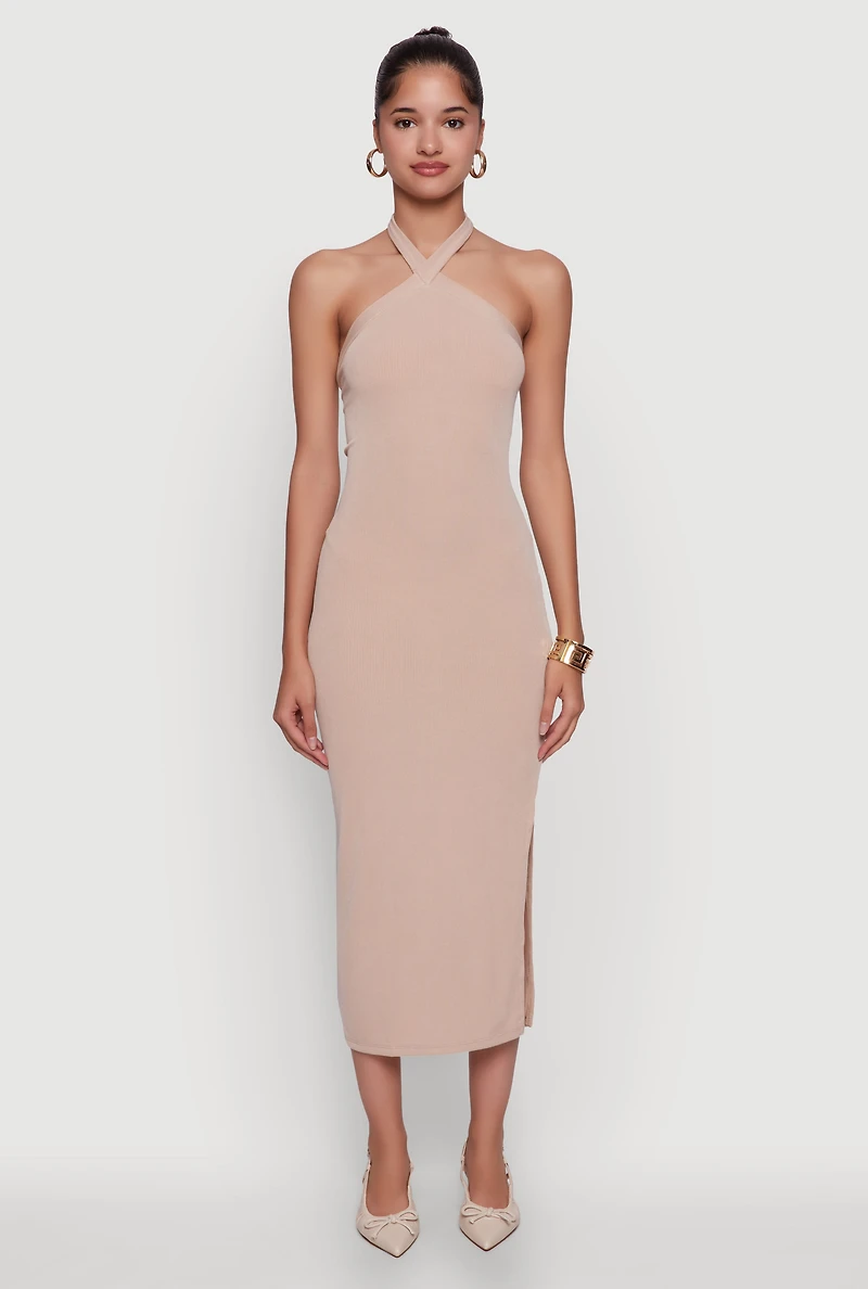 Ribbed Knit Bodycon Halter Dress with Side Slit