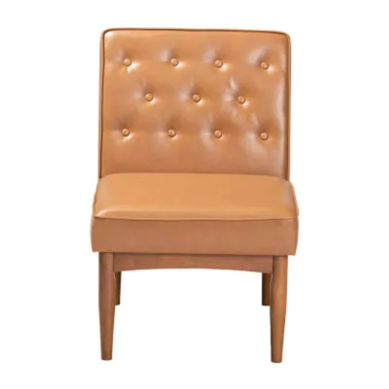 Enjoy the casual comfort and tasteful design of the Riordan dining chair. Made in Malaysia, the Riordan is constructed from walnut brown finished wood that radiates natural warmth. The chair is padded with plush foam and upholstered in smooth faux leather for superb comfort with a modern touch. Requiring assembly, the Riordan features elegant button tufting for rich texture and depth. Slim, tapered legs lend a touch of mid-century charm. A perfect addition to smaller dining rooms and nooks, the Riordan dining chair elevates the feel of any space. Dimensions: 31.5" High x 22" Wide x 27" Deep; Seating Dimensions: 17.3" High x 22" Wide x 20.1" Deep; Back: 14.2" High; Legs: 11.4" High;