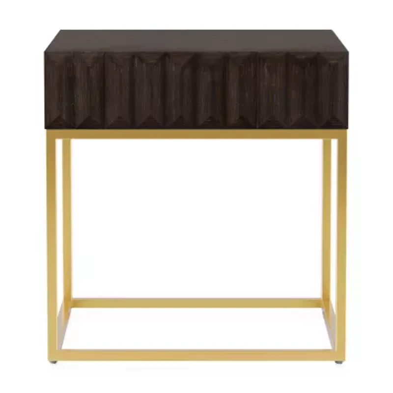A beautifully decorative drawer front creates compelling texture and visual detail for this wood one-drawer end table. Complete with a walnut and gold finish metal frame, the table is a sleek design that creates a perfect accompaniment to a recliner or loveseat. From the living room to your inviting den, this end table creates concealed storage that's great for keeping your space clutter-free and looking its best.
