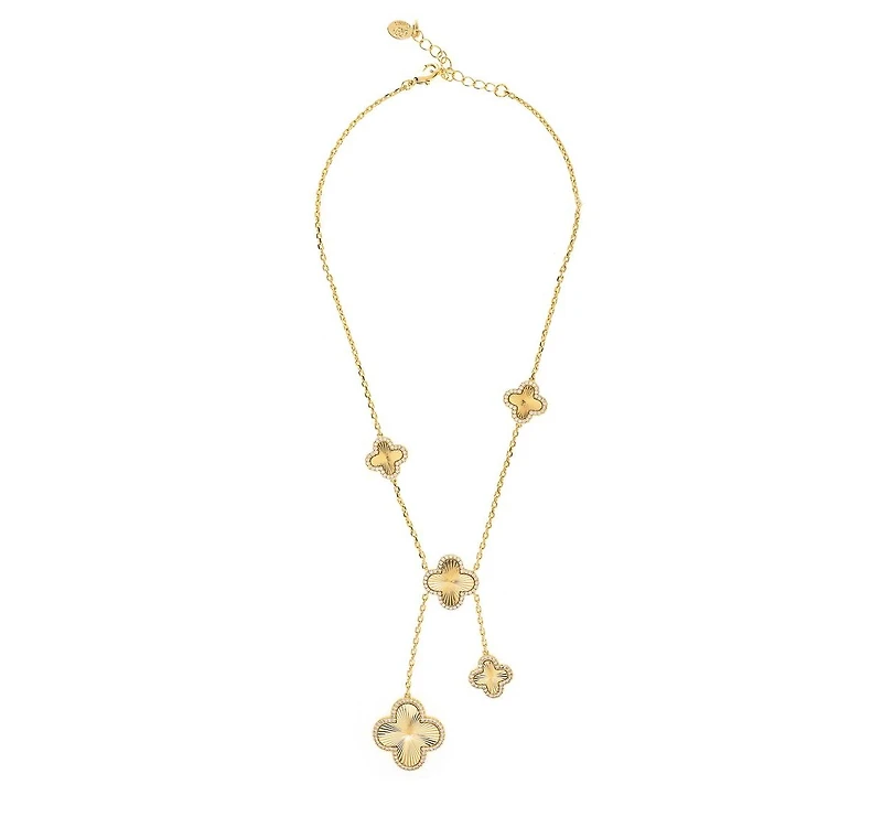 Delicate with a touch of sparkle, this elegant Y-necklace brings graceful movement and modern charm to your jewelry collection. Featuring multiple clover-shaped stations accented with shimmering cubic zirconia, the design flows into a refined drop silhouette that elongates the neckline. Finished in radiant 18K gold-plated metal, it s perfect for layering or wearing solo as a statement piece.