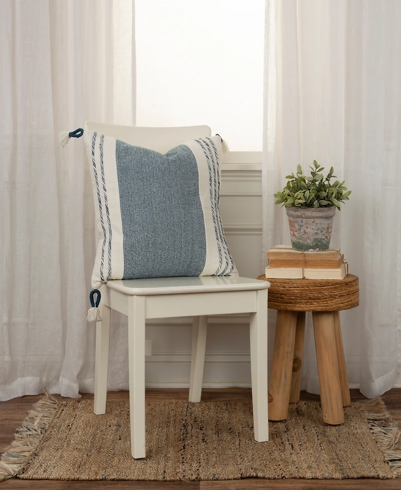 Add some cozy urban farmhouse sophistication to any living space with this stylish accent pillow from Rizzy Home. This dimensional piece is constructed of cotton and features a woven, knife-edged block stripe with a two-color woven center panel, white in and out woven cotton side panels, and coordinating solid cotton back. Looped, hand-tied tassels provide added texture, while two-color twisted yarn roping and a hidden zipper closure add extra elements of charm. In a classic colorway, this modern craft pillow is perfect for making a bold statement in any smart home decor.
