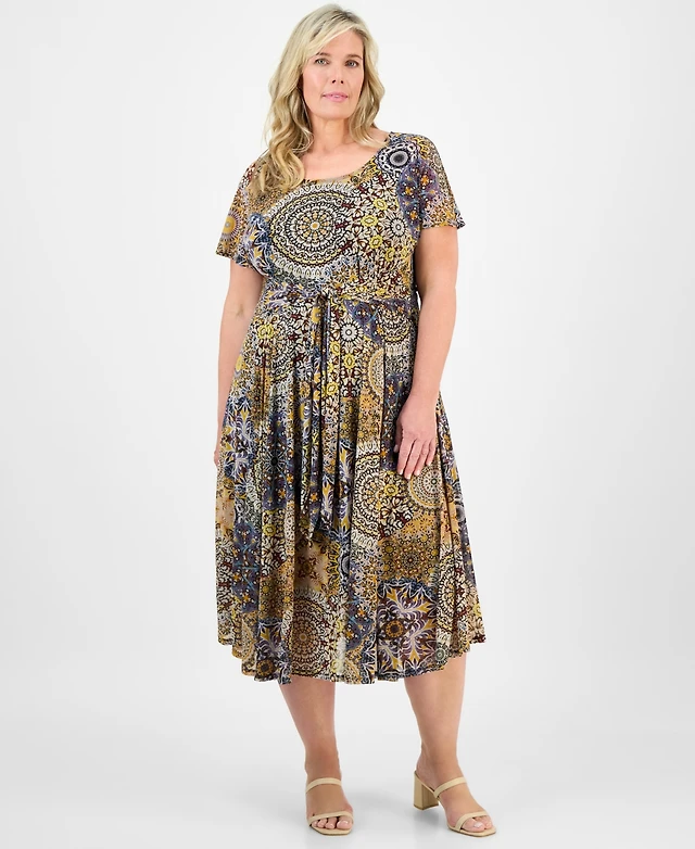 Robbie Bee Plus Size Printed Tie-Waist Midi Dress