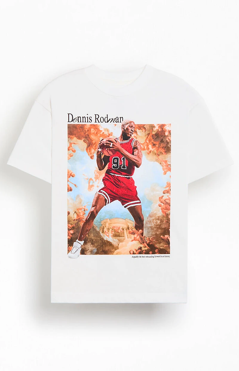 Step up your casual style with a wild twist in the Fine Art T-Shirt from Rodman Brand. This cool tee has short sleeves, a crew neckline, and a standout front graphic of Dennis Rodman in his element with a basketball in his hand with a fine art painting in the background.