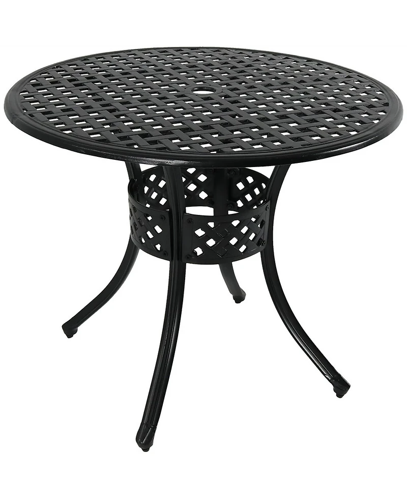 Make dinner time more enjoyable with this stylish, 33"" round dining table. Whether it's on a patio or in the backyard, this table is sure to add a sophisticated look with the small, intricate details on the tabletop and rounded table legs. This table boasts an elegant cross-weave pattern to effortlessly complement any existing modern or contemporary outdoor home aesthetic. Made from durable, weather-resistant cast aluminum material, this outdoor patio table is sure to last for many years to come. The 2"" diameter umbrella hole allows an umbrella to be added to the table to provide shade while unwinding and enjoying this table (please note, an umbrella is not included and must be purchased separately). Create a comfortable and classy place to unwind at the end of a long day outdoors with this beautiful, strong, and sturdy patio table. Invite friends and family over for tea, brunch, or create an effortless conversation piece for any space.