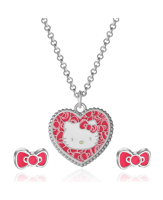 Sanrio Hello Kitty Fashion Jewelry Set, Heart Necklace and Bow Stud Earrings, Officially Licensed