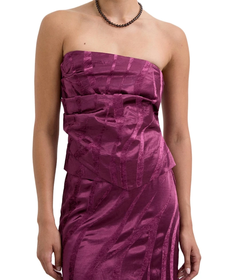 Top made of satin fabric with velvet interlaced print and gathers on the side and asymmetric hem