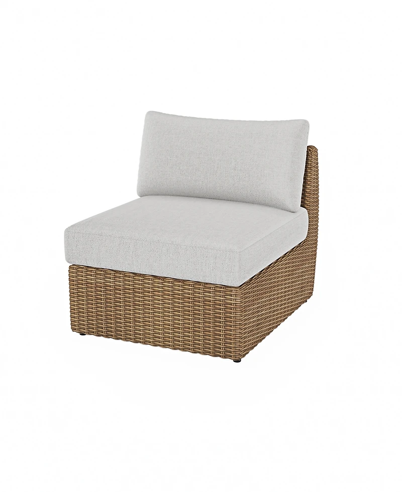 The Sculptura armless club chair offers modular versatility with sculpted curves and plush, weather-resistant cushions. Built with rust-proof aluminum and wrapped in rich wicker, it's perfect for customizing your outdoor layout with comfort and style.