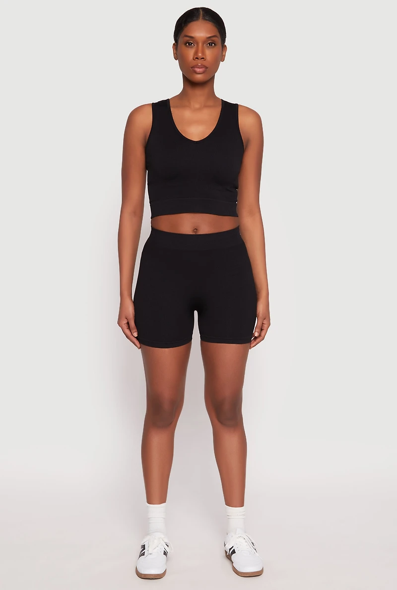 Looking for a fresh and comfy set that keeps you looking effortlessly cool? Meet the Seamless V Neck Crop Top and Biker Shorts — your new go-to for activewear, lounging, or casual outings. Made from soft ribbed knit, this 2-piece set offers a classic fit with a timeless silhouette that flatters every body. The sleeveless V-neck tank top with a cropped hem pairs perfectly with sleek biker shorts, giving you a stylish edge without sacrificing comfort. Whether you're hitting the gym or just running errands, this set is designed to keep up with your busy lifestyle and make you feel confident all day long. Made from soft ribbed knit material for all-day comfort Seamless design minimizes chafing and provides a sleek look V-neck sleeveless crop top with a cropped hem for a flirty, trendy vibe Classic fit and timeless silhouette that suits all body types Perfect for activewear, casual outings, or lounging at home 2-piece set that’s easy to mix and match with other wardrobe staples Model Pictured Wearing Size S Fits True To Size Content and Care Material: 94% Nylon, 6% Spandex Care Instructions: Machine Wash, Tumble Dry Country Of Origin: China Rainbow Item Number 1097075173163 BLACK - 1097075173163001