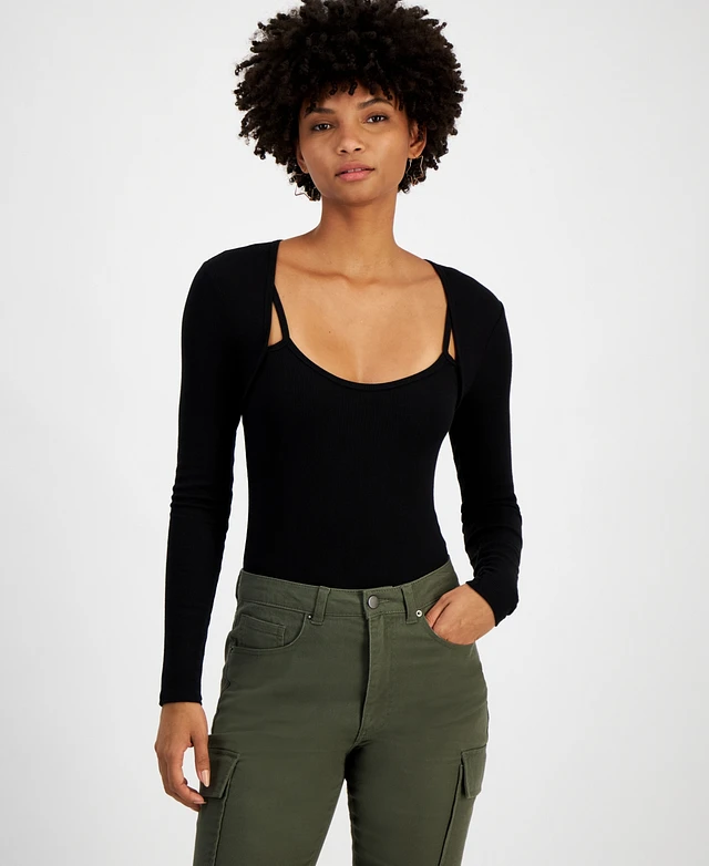 Self Esteem Juniors' Rib-Knit Overlay Long-Sleeve Bodysuit