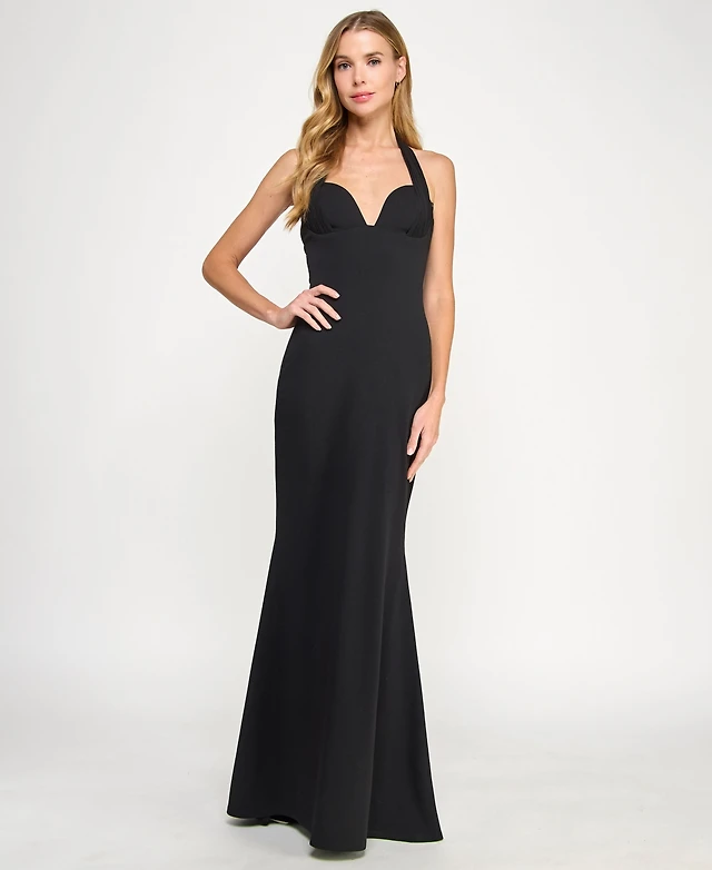 Seni & Cade Juniors' Plunging Black Halter Gown
