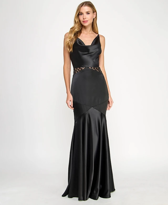 Seni & Cade Juniors' Satin Cowlneck Cutout Gown