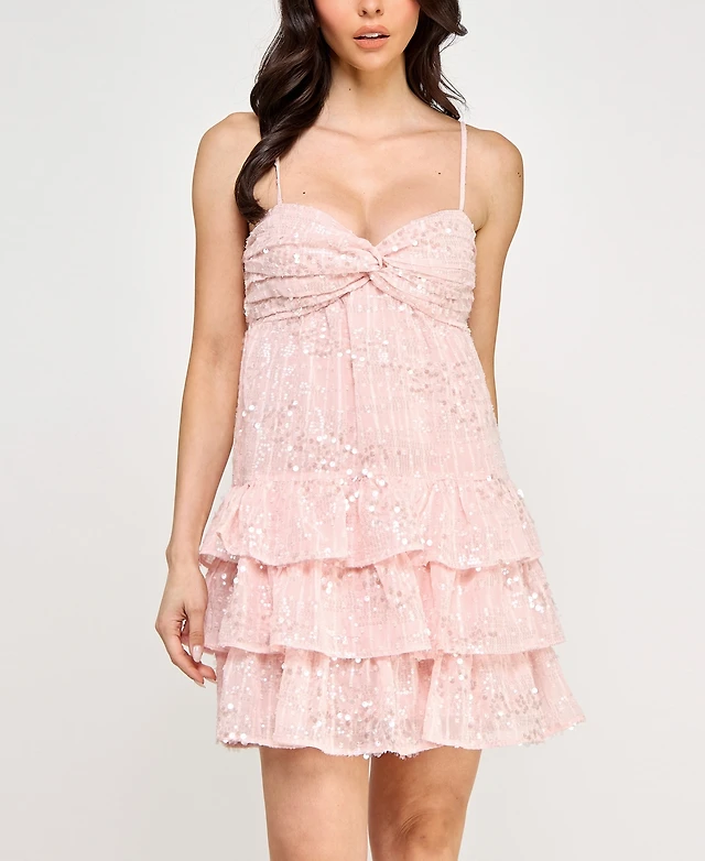 Seni & Cade Juniors' Ruffle-Trim Cutout Beaded Mini Dress