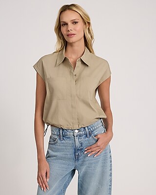 Cap Sleeve Double Pocket Adjustable Hem Shirt