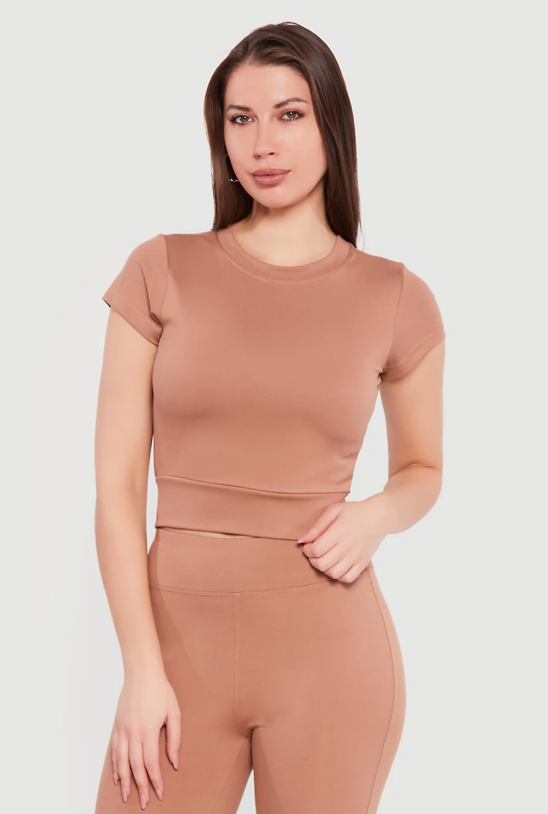 This active top features a high neckline and short sleeves for a clean, classic fit that suits everyday casual and athletic wear. Its tummy-tucking design offers a flattering silhouette without sacrificing ease of movement, making it a versatile choice for your active lifestyle. High neckline adds sleek coverage and style Short sleeves keep you cool during workouts or errands Classic fit with tummy-tucking detail enhances your shape Model Pictured Wearing Size S Height 5 ft 9 in, Bust 34 in, Waist 27 in, Hips 38 in Fits True To Size Content and Care Material: 88% Polyester, 12% Spandex Care Instructions: Hand Wash Country Of Origin: China Rainbow Item Number 1413062700437 TAN - 1413062700437405