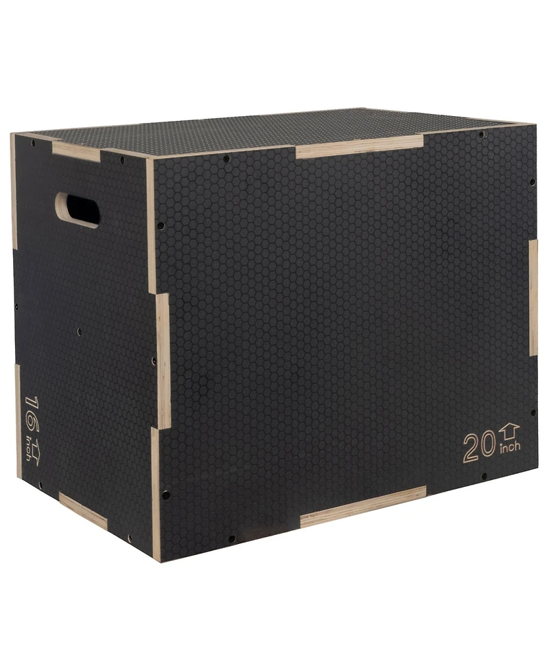 Designed for fitness enthusiasts of all levels, this versatile plyometric box offers a range of exercises to boost your agility, strength, and endurance. Crafted from high-quality wood, this workout accessory ensures durability and stability, making it a reliable companion for your workout routines. The non-slip surface provides a secure platform, allowing you to perform jumps, step-ups, and other exercises confidently. With 3 different height options (24-inch, 20-inch, and 16-inch) in one box, you can customize your workouts to match your fitness level and goals whether training for sports, improving your cardiovascular health, or enhancing your overall fitness, this plyo box is designed to meet your needs.