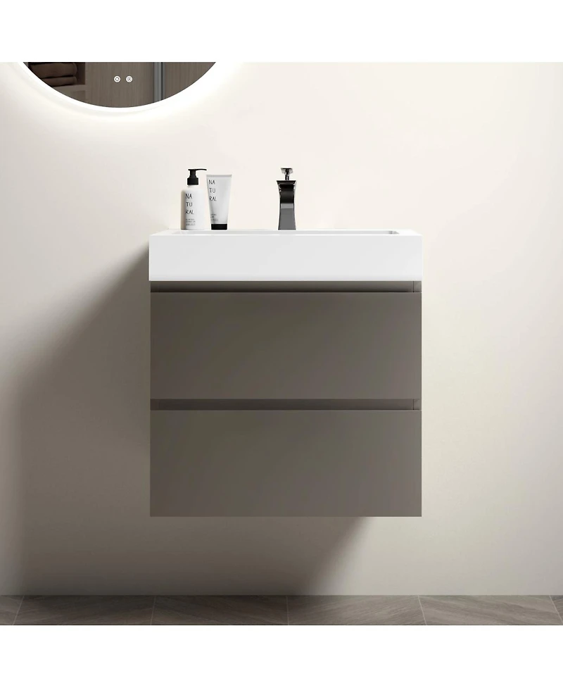 Elevate your bathroom with this 24'' modern wall mount vanity, expertly designed for both style and functionality. The floating installation creates a contemporary, open look and allows for effortless cleaning underneath. Two large soft close drawers offer generous storage space for all your daily essentials, gliding smoothly and quietly to reduce clutter and noise. The handle-free, minimalist design brings a sleek, seamless aesthetic that fits any decor. Built from E1 grade particle board, this vanity ensures durability and low emissions for a healthier home. Completed with a high-quality, abrasion-resistant basin, this piece provides lasting performance and an easy-to-clean surface for everyday convenience.