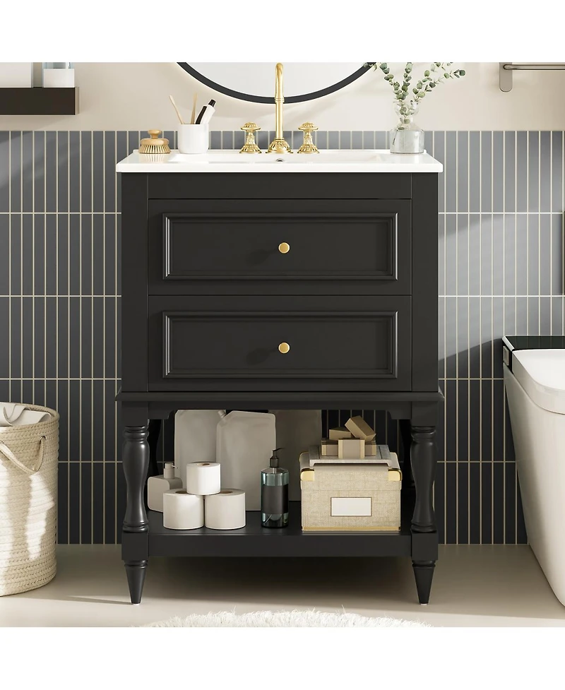 Transform your bathroom with a vanity that blends timeless retro charm and modern function. Detailed carvings on the graceful legs add a classic touch, while the high-gloss ceramic sink offers easy maintenance and an anti-spill feature for practical convenience. The open back design makes installation simple and provides quick access for plumbing.Keep your essentials organized—enjoy the tip-out upper drawer for small daily items and the spacious U-shaped lower drawer for larger bathroom needs. The open bottom shelf gives you accessible storage for towels or baskets. Combining sophistication with smart storage, this vanity is the perfect centerpiece to enhance your bath space.Product dimensions: 24.4 x 18.4 x 33.7 inches (cabinet with sink).